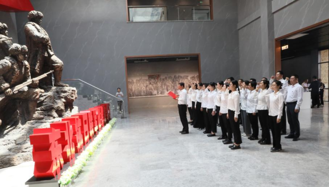 在抗日战争纪念馆,党员代表面对庄严的中国共产党党旗,高举右拳,重温入党誓词。铿锵有力的誓言,坚定了党员代表“不忘初心、牢记使命”的信念。