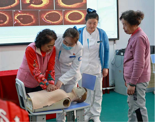 在健康讲座环节,心内科医生孙娟、周秀明结合多年临床诊疗经验,以通俗易懂的语言、鲜活真实的案例,围绕“冬季心血管疾病预防与日常养护”核心主题,详细讲解低温环境对血管的刺激危害、心血管疾病常见危险信号的识别方法,同时传授科学饮食、合理运动、规范用药等实用日常养护技巧,引导群众树立“早预防、早发现、早治疗”的健康理念。讲座结束后,护理人员现场演示心肺复苏标准操作流程,耐心指导动作要领,并邀请现场群众亲手实践操作,切实提升群众应急自救能力。与此同时,活动现场同步开展免费血糖、血压检测、心电图检查,以及眼部视力测试、眼底镜检查等便民服务,医护人员对检测结果进行细致解读,针对异常情况给出个性化健康指导和诊疗建议,全程耐心解答群众关于各类慢性病防控、日常保健的疑问。