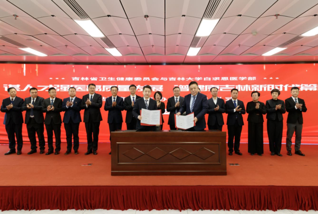 省卫生健康委副主任王国庆(前排左)、吉林大学白求恩医学部党工委常务副书记伊大海(前排右)分别代表双方签署战略合作协议。