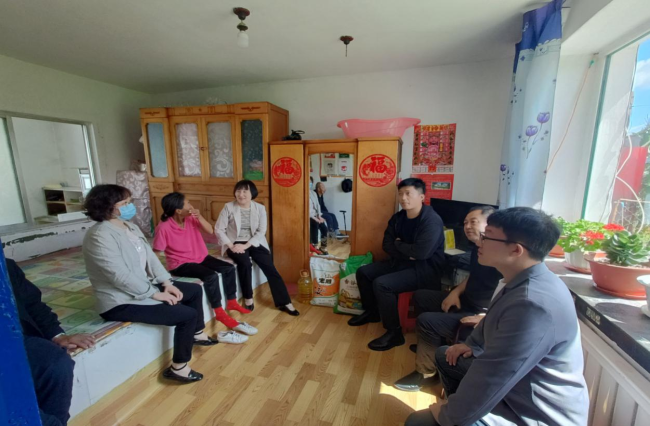 支部书记李春子带队与驻村书记孙立新、驻村干部历小强一起到包保户刘玉杰家走访,仔细询问了她的身体健康情况,并为她带去米、面、油等生活用品和慰问金。