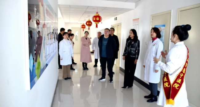 白山市康宁医院职工为前来参观学习的党员讲解党建文化墙设计理念