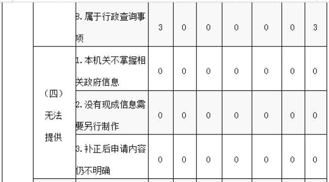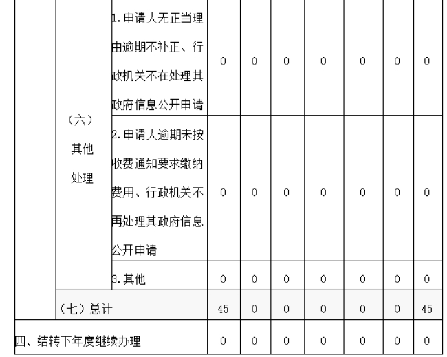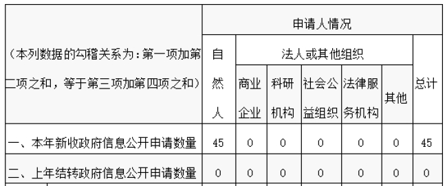 (三)依申请公开情况。本年度共收到政府信息公开申请数量45件,其中,予以公开40件,不予公开4件,无法提供0件,不予处理0件。45件政府信息公开申请中信函和现场申请共0件,占总申请数量的0%;网络申请45件,占总申请数量的100%,目前均已办结并以书面形式告知申请人。